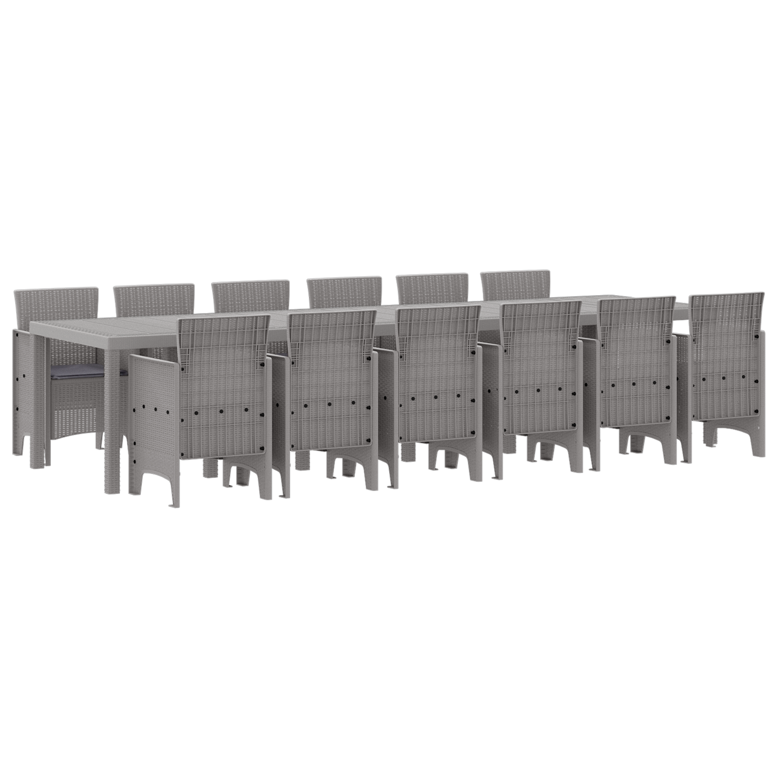 Dette 13-delte hagemøbelsettet er perfekt for utendørs spising, med en super kombinasjon av stil og funksjonalitet. Den lysegrå polyrottingen er både holdbar og moderne, noe som gjør det ideelt for terrasser, balkonger eller hager. Perfekt for samlinger med venner og familie.