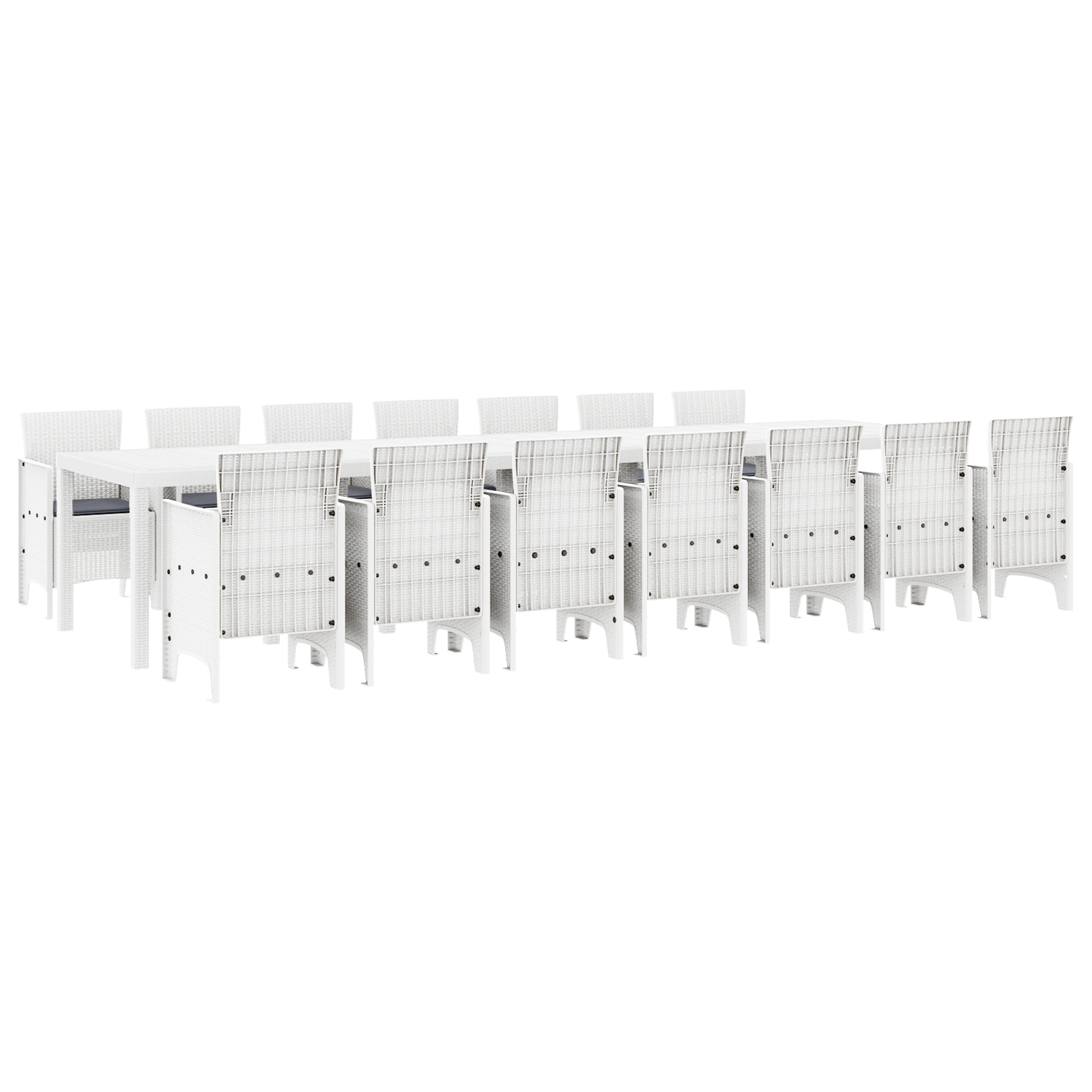 Dette hage spisebordsettet kombinerer praktisk bruk og stil. Det har et stilrent rektangulært bord og 14 komfortable stoler i en chic hvit finish, perfekt for sammenkomster og måltider ute. Med sitt moderne utseende hever det stemningen på enhver balkong eller terrasse, og er perfekt for familiesammenkomster eller å underholde venner mens man nyter solen.