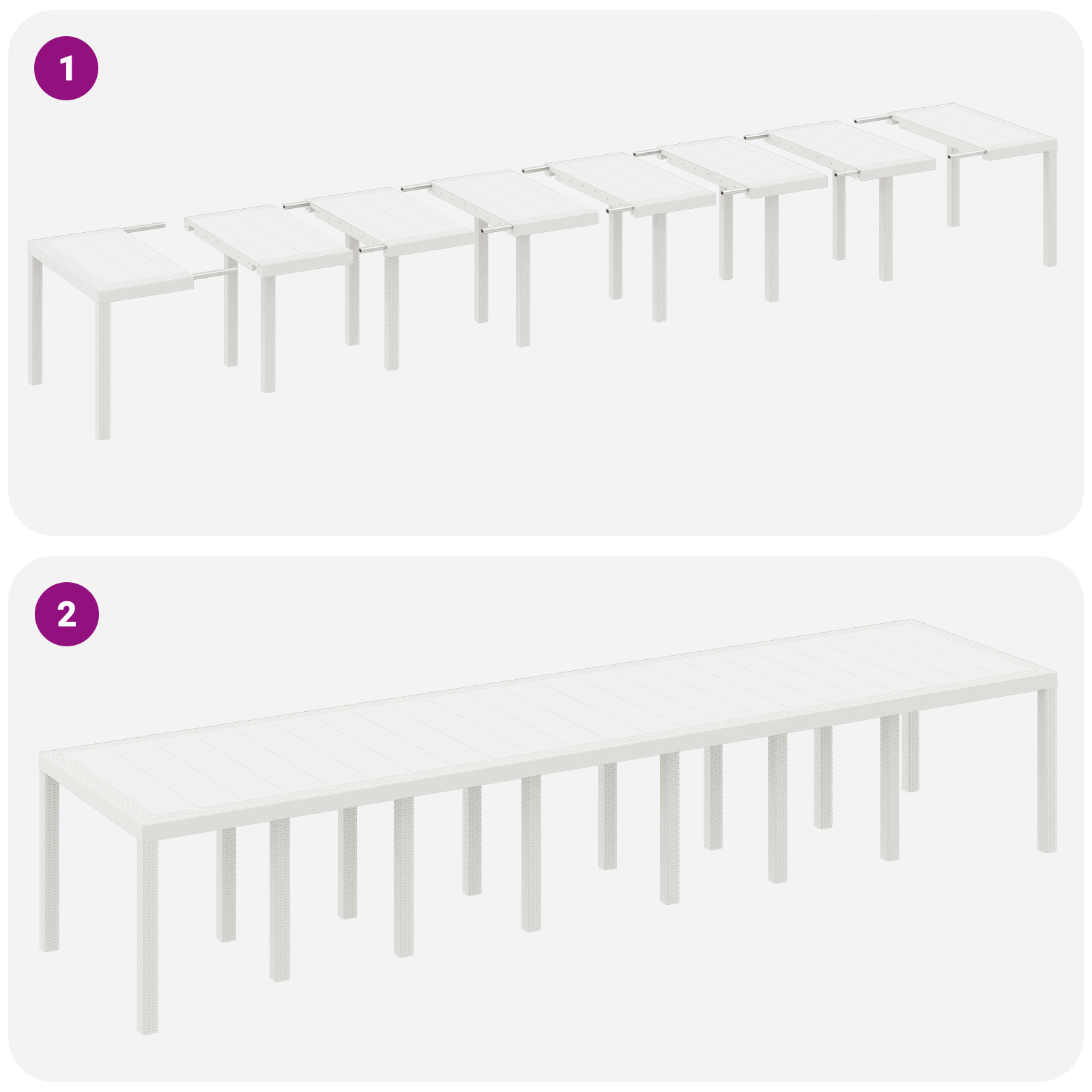 Dette hage spisestue settet kombinerer stil og funksjon, med et pent rektangulært bord og 14 komfortable stoler. Det er perfekt for utendørs måltider og sammenkomster. Med en moderne stil og en stilfull hvit farge, løfter det enkelt utseendet til hvilken som helst balkong eller terrasse, ideelt for familiemiddager eller vennebesøk ute.