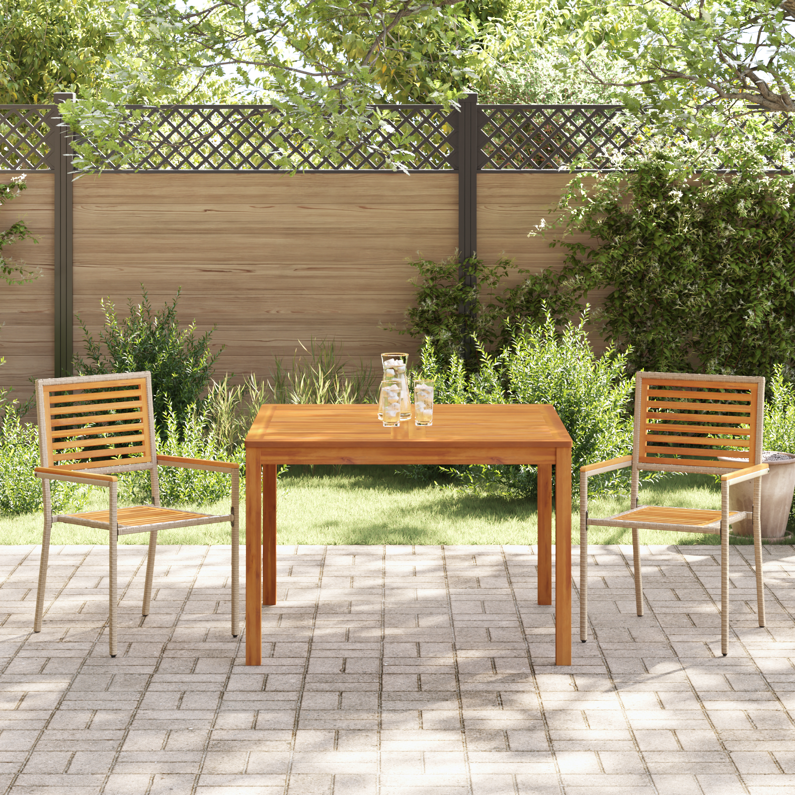 Dette nydelige hage spisebordsettet i beige gir både stil og praktisk bruk, perfekt for å oppgradere uteområder. Settet inkluderer et firkantet bord og to matcherende stoler, laget av lett massivt akasietre som er UV-resistent.