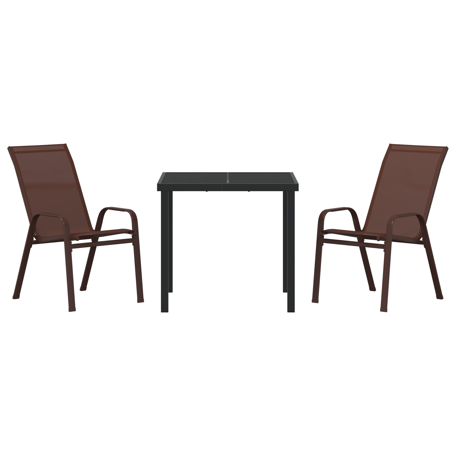 Dette 3-delte hage spisebordsettet er perfekt for stilig utendørs moro. Det blander praktisk funksjonalitet med et moderne design. Med sin dype brune og slank svarte stål, hever det stemningen i ethvert utendørsområde og gir komfortable sitteplasser for måltider, avslapning eller bare for å nyte frisk luft.