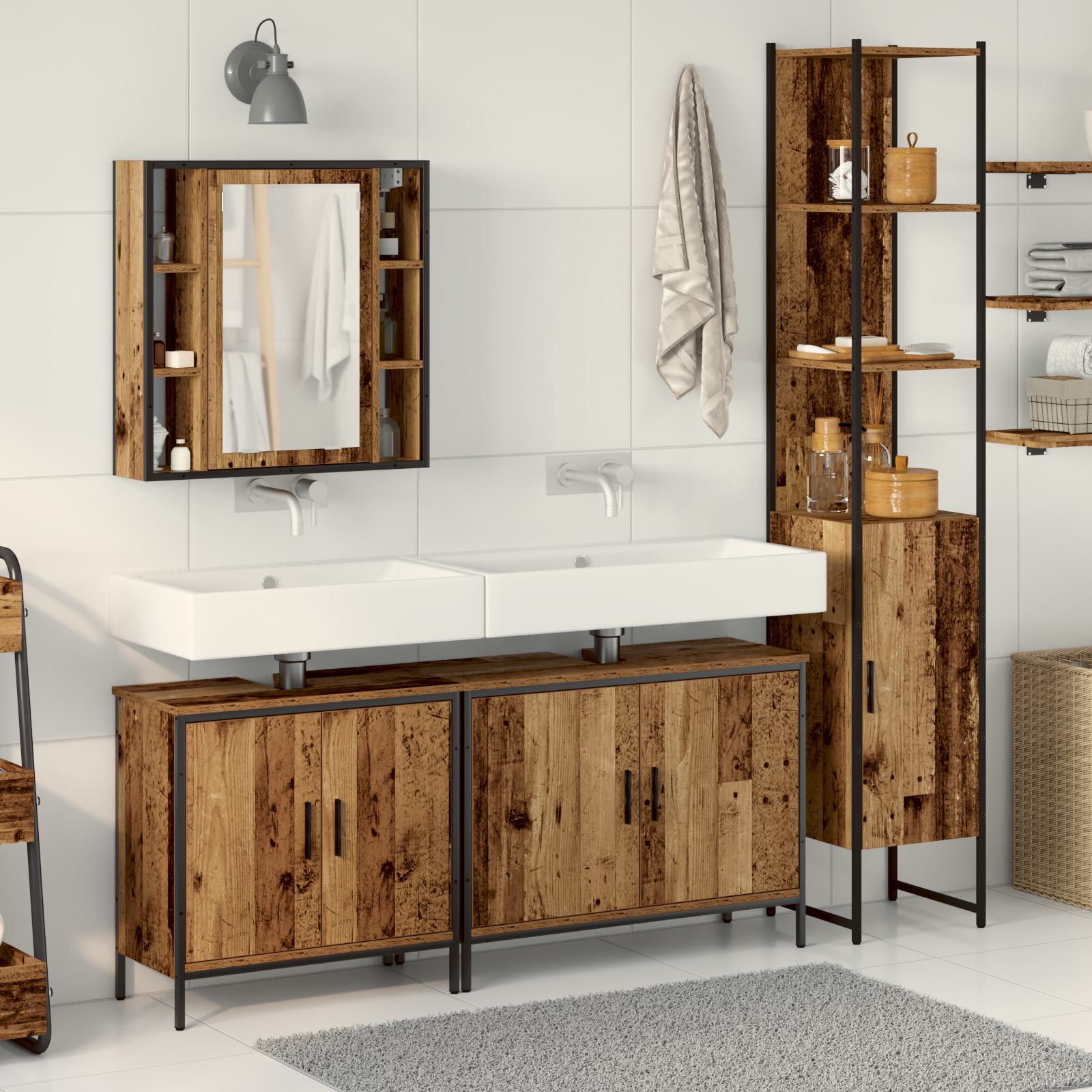 Dette baderomsmøbelsettet har et lekkert gammelt treutseende—perfekt for moderne rom som ønsker en dose rustikk sjarm. Det er et stilrent skap, en høy hylle, og et stilig speil som kombinerer praktisk bruk med god stil, ideelt for voksnes baderom som trenger ryddig lagring.