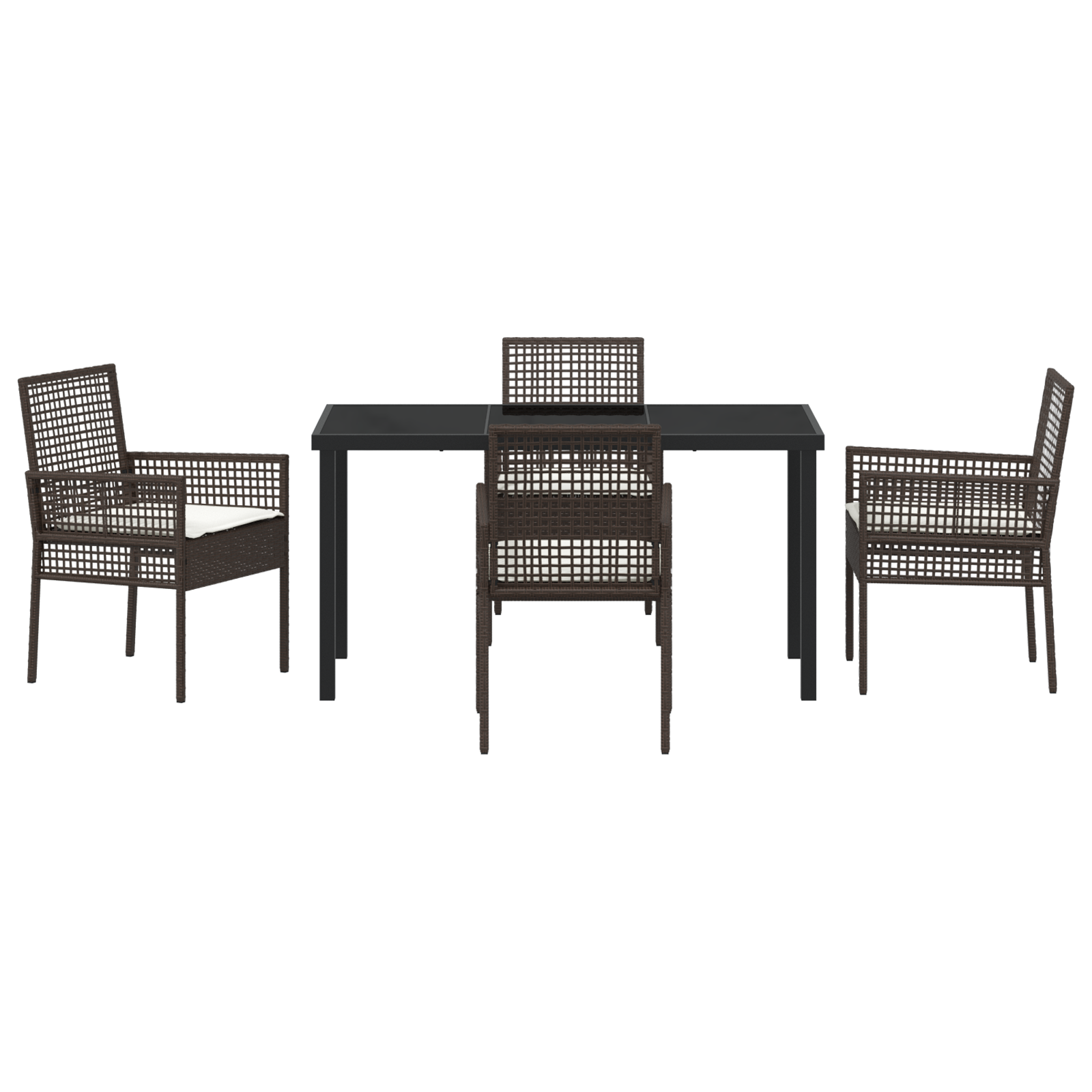 Dette hagediningsettet gir en moderne vibe med fokus på komfort og stil, og er det perfekte valget for ditt utendørs spiseområde. Det inkluderer fire lekre stoler og et romslig rektangulært bord i stilige brun- og kremhvite farger som hever balkongen eller terrassen din.