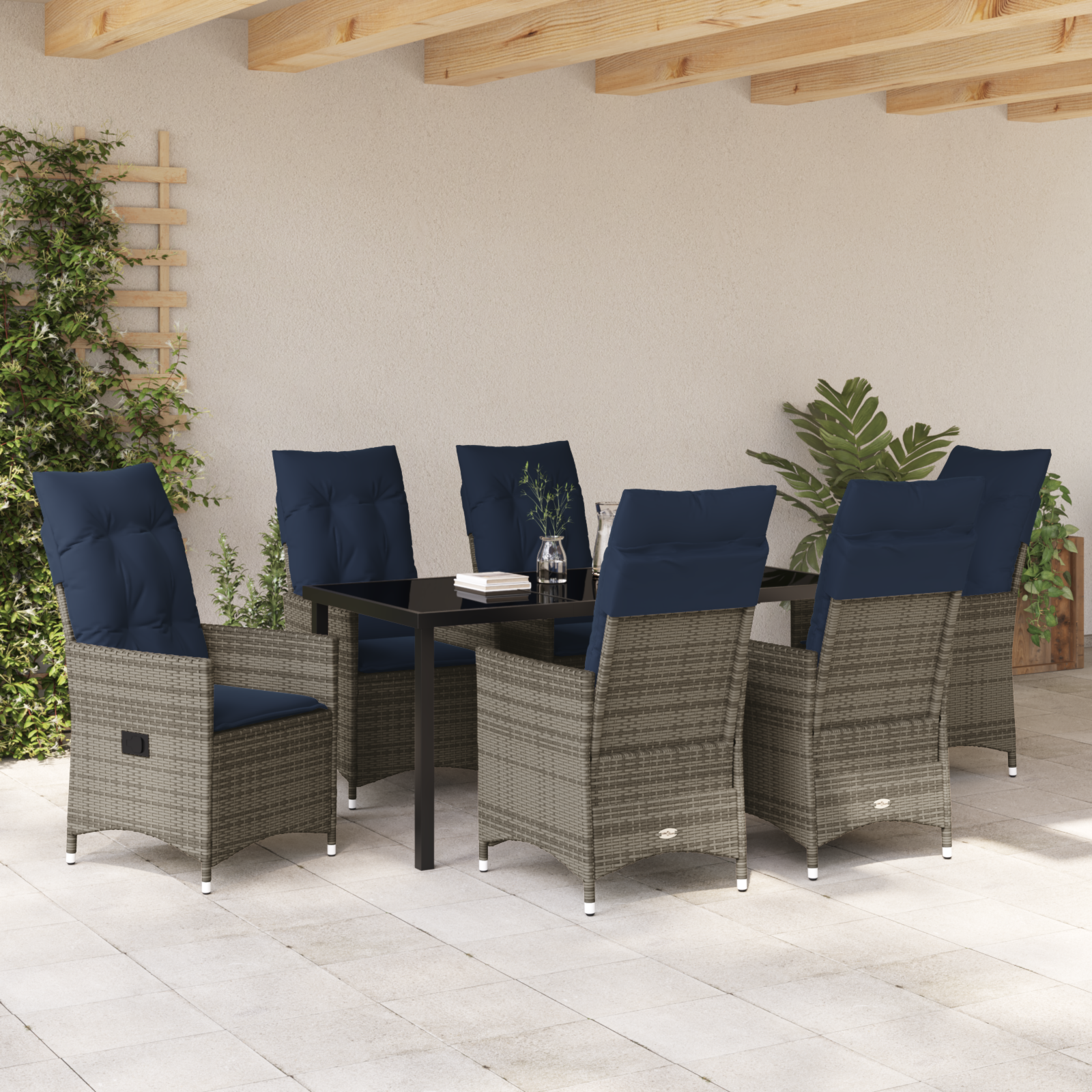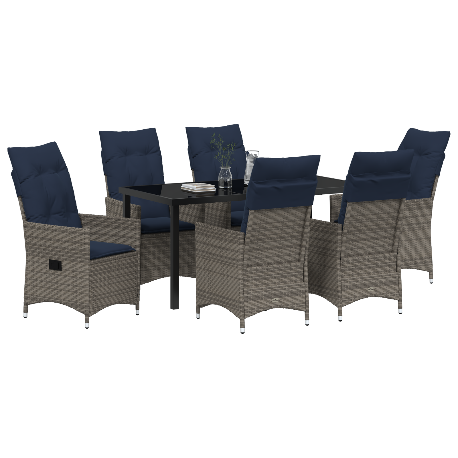 Vi presenterer vidaXL 7-delers Hage Spisebordsett, som er praktisk og stilig. Det er ideelt for større sammenkomster, med et romslig rektangulært bord og seks koselige stoler, alt med marineblå puter for en innbydende spiseopplevelse for familie og venner.