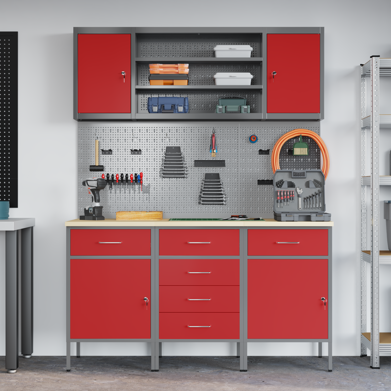 - Levering inneholder: 2 x Arbeidsskap (ett med 1 dør og 1 skuff), 1 x Arbeidsskap (med 4 skuffer), 3 x Verktøy veggpanel, 1 x Verktøy skap