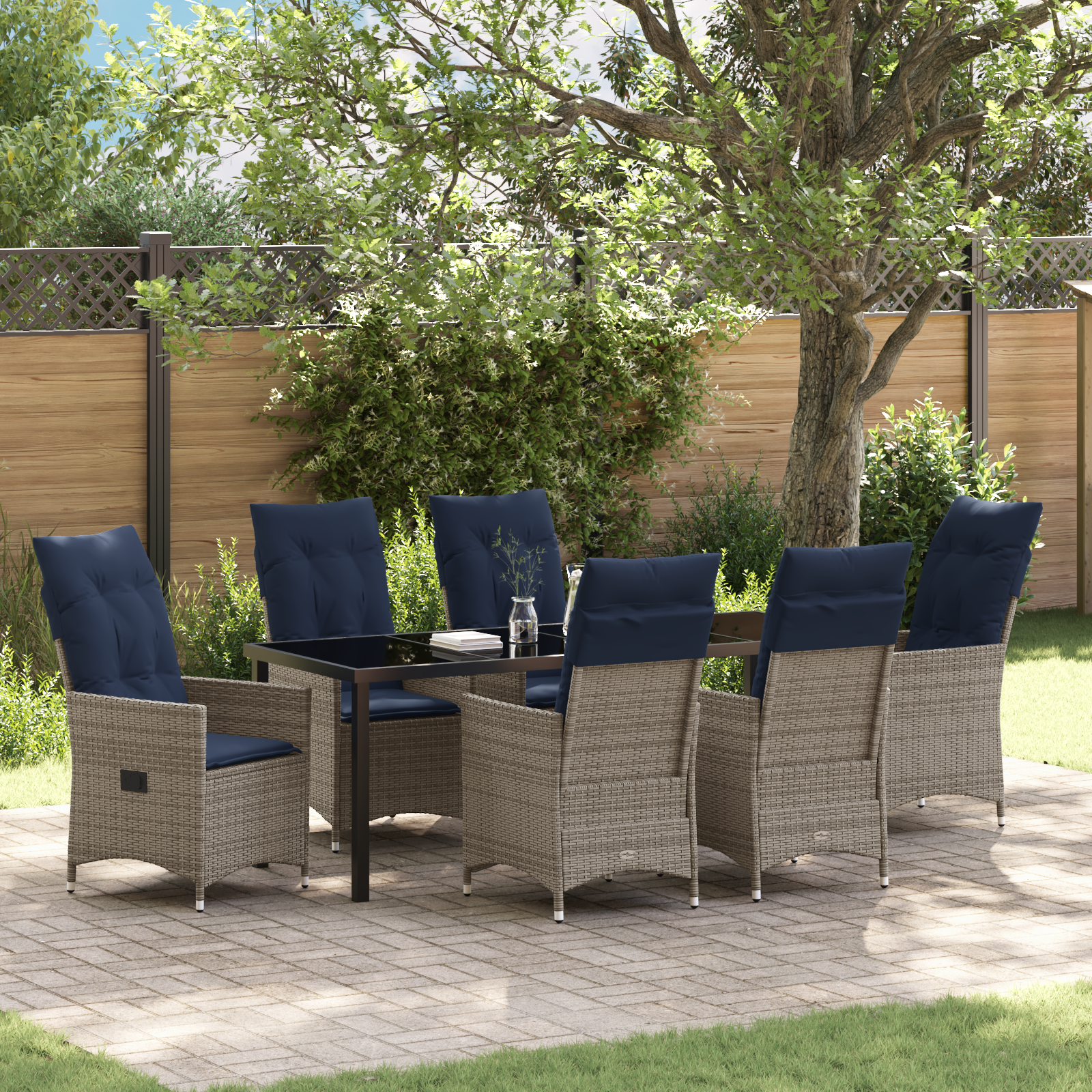 vidaXL 7-delt hage spise sett handler om stil og funksjonalitet, med et moderne design som passer til enhver balkong. Settet inkluderer et solid rektangulært bord og seks komfortable stoler, hver med havblå puter. Perfekt for familiemåltider eller venne-sammenkomster.