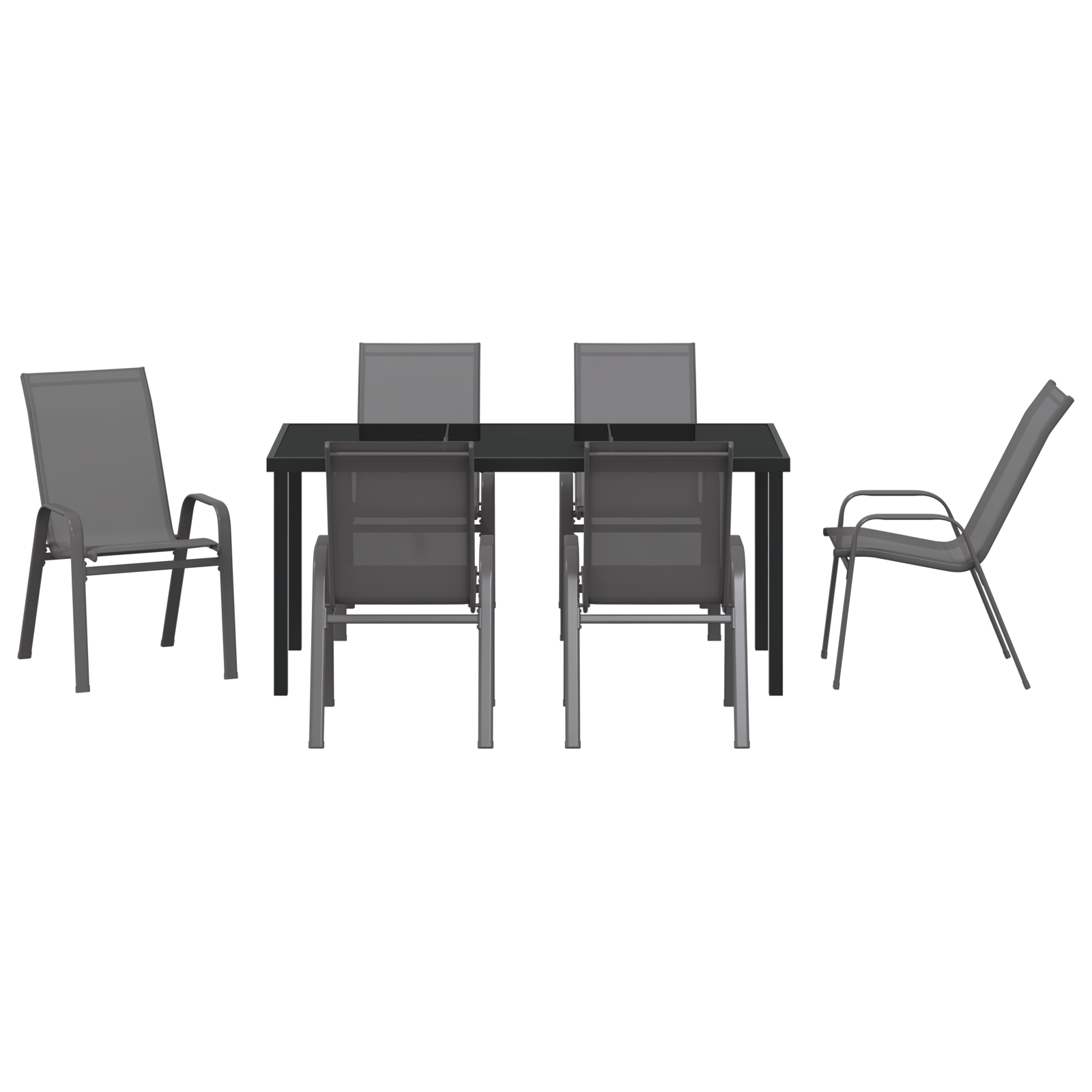 Dette 7-delte hage spisebordsettet er skapt for å gi deg variert moro utendørs, med en flott kombinasjon av stil og funksjonalitet. Med moderne grått stål og tekstilene design, vil det freshe opp enhver hage eller terrasse, og gir deg god plass til å spise, slappe av eller bare være ute.