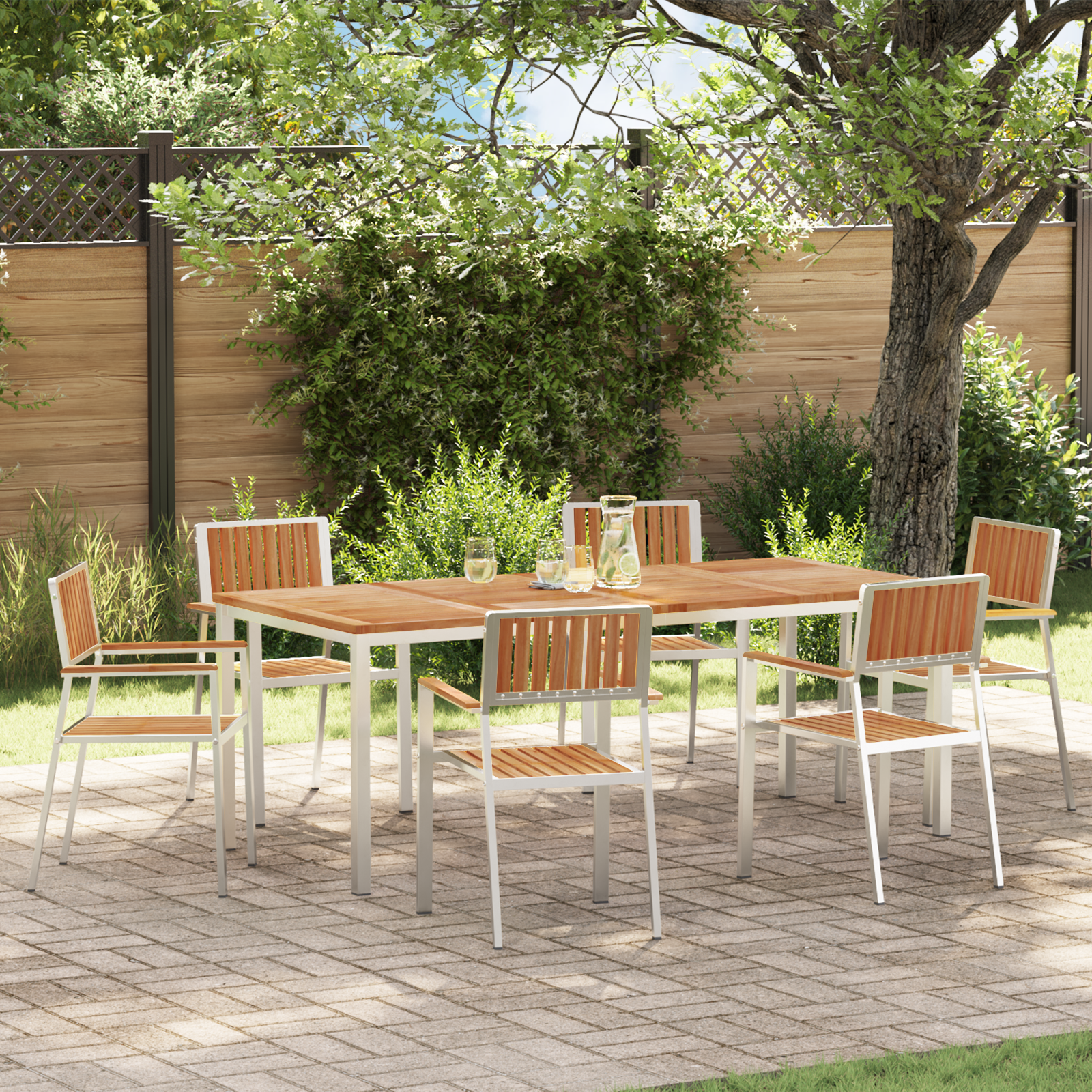 Dette hagemøbelsettet har et flott rektangulært bord sammen med seks matchende stoler, alle laget av massivt teaktre. Det er perfekt for å underholde utendørs, og inviterer venner og familie til å nyte måltider på balkongen eller terrassen.