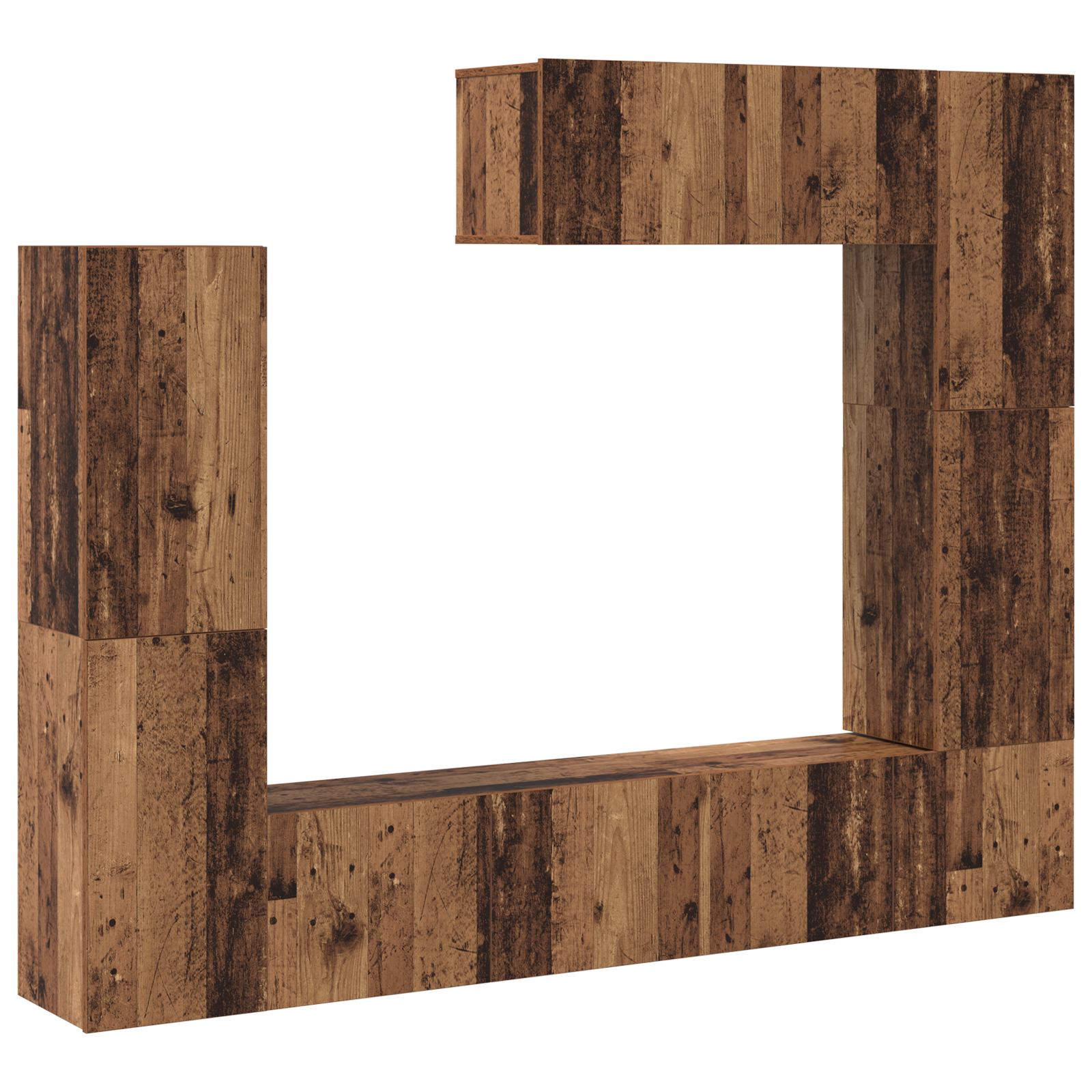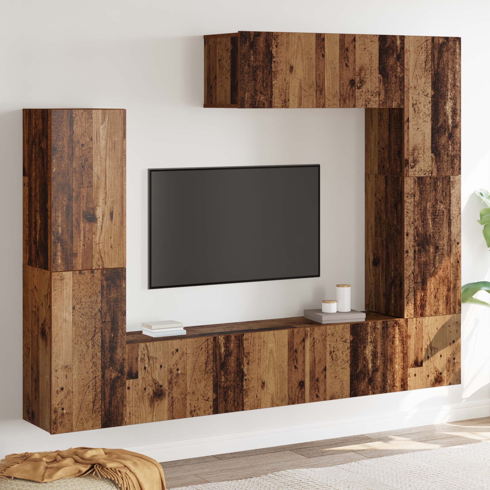 7-delt TV-skapsett, veggmontert, gammelt tre, konstruert tre