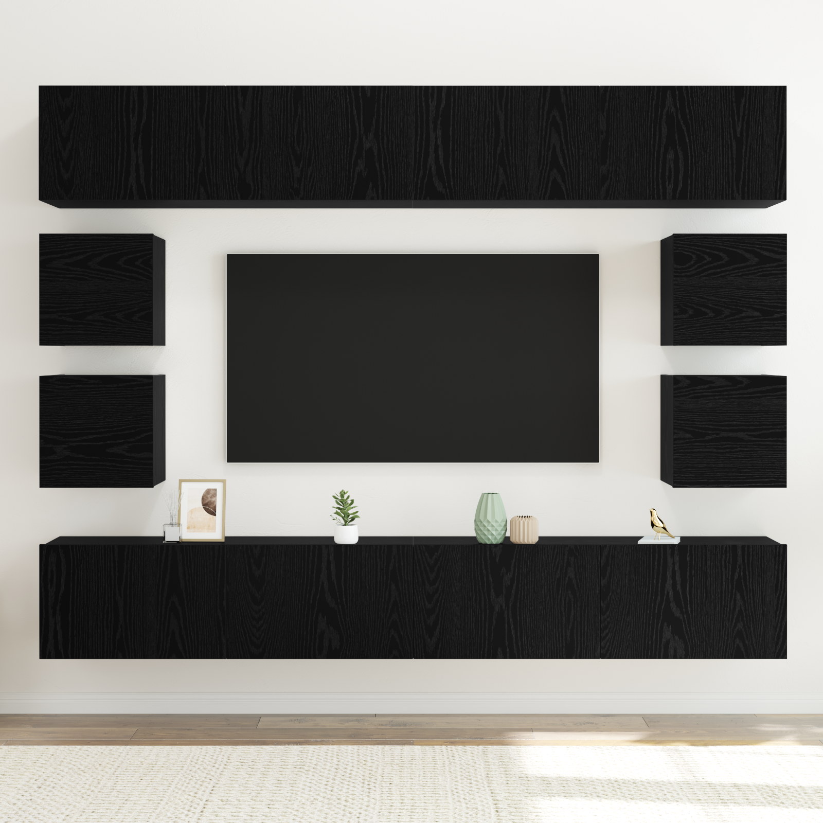 8-delt TV-skapsett – Veggmontert svart eik, laget av konstruert tre