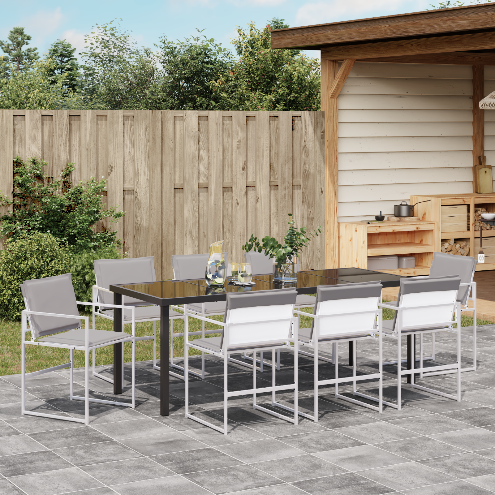 Dette romslige hage-spisegruppen blander moderne stil med funksjonalitet, og er perfekt for å underholde eller slappe av utendørs. Med sitt stilige hvite design og solide materialer, kommer dette 9-delte settet med åtte komfortable stoler og et stort bord som passer supert for større sammenkomster eller familiemåltider. Textilene-stoffet og den sterke stålrammen takler forskjellige værforhold, så du får både stil og holdbarhet.