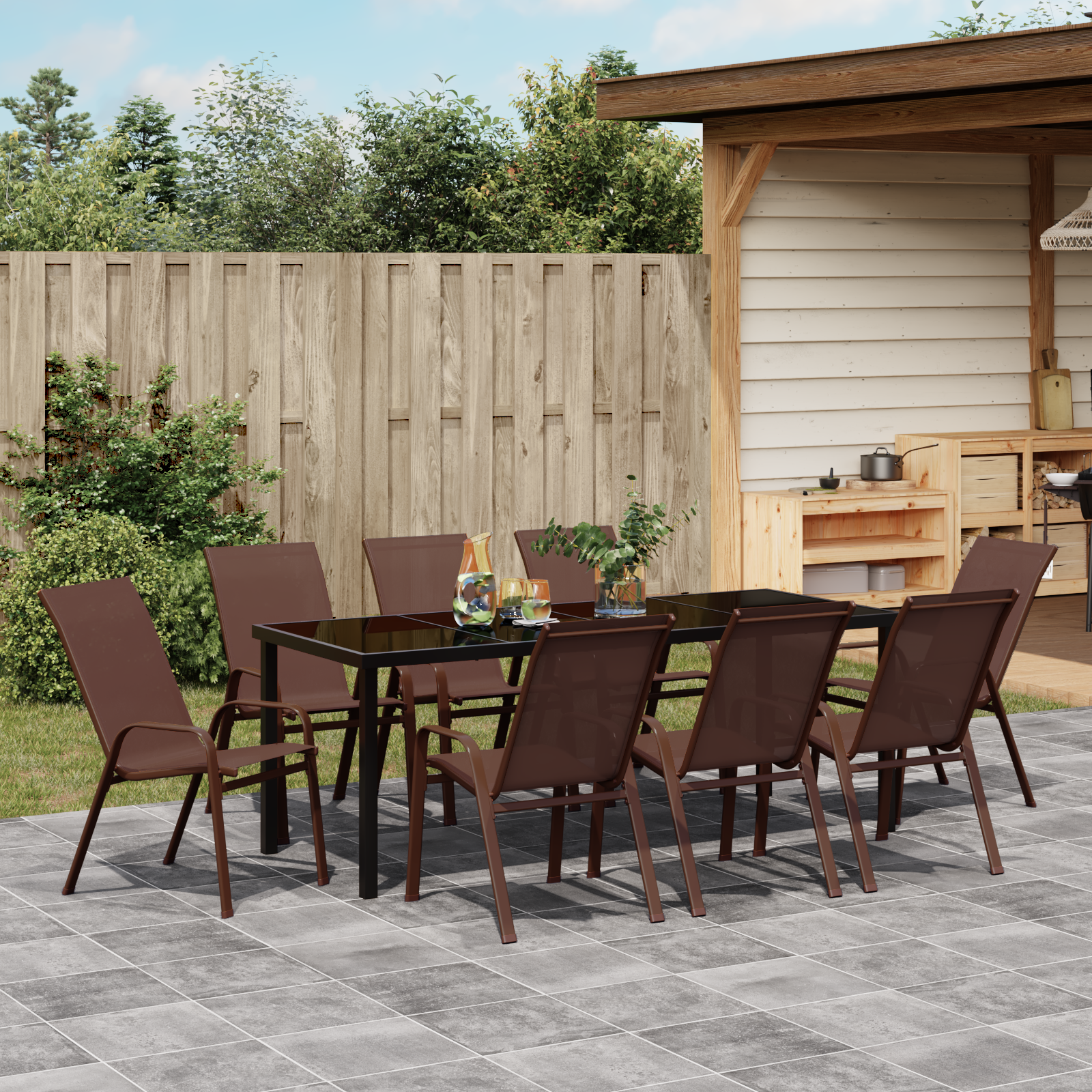 Denne 9-delte hage spisegruppen er akkurat det du trenger for store samlinger ute. Den blander stil og praktikalitet. Med sitt stilige brune ståluttrykk, gir den liv til uteplassen din og tilbyr mye plass for å spise, slappe av, eller bare nyte frisk luft.