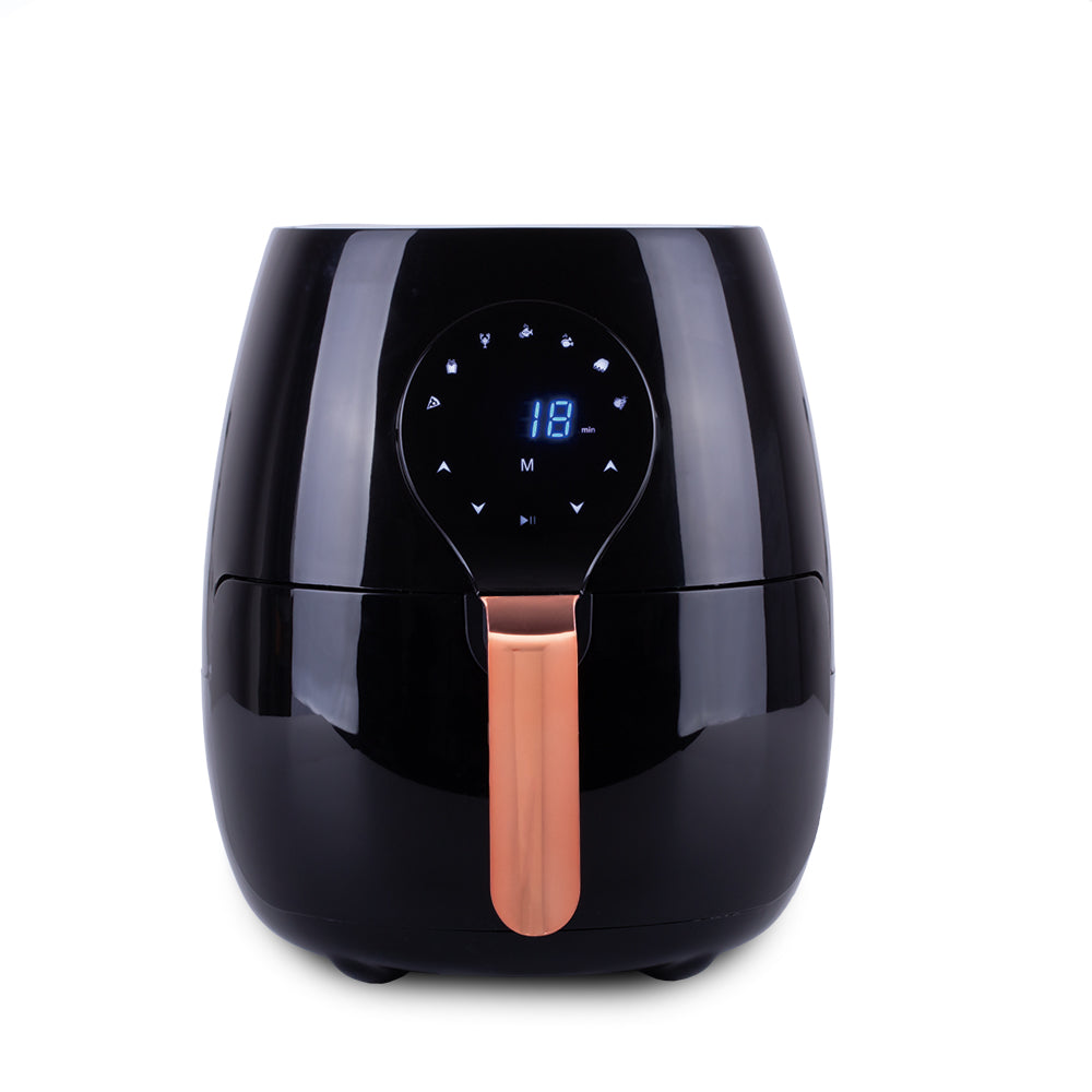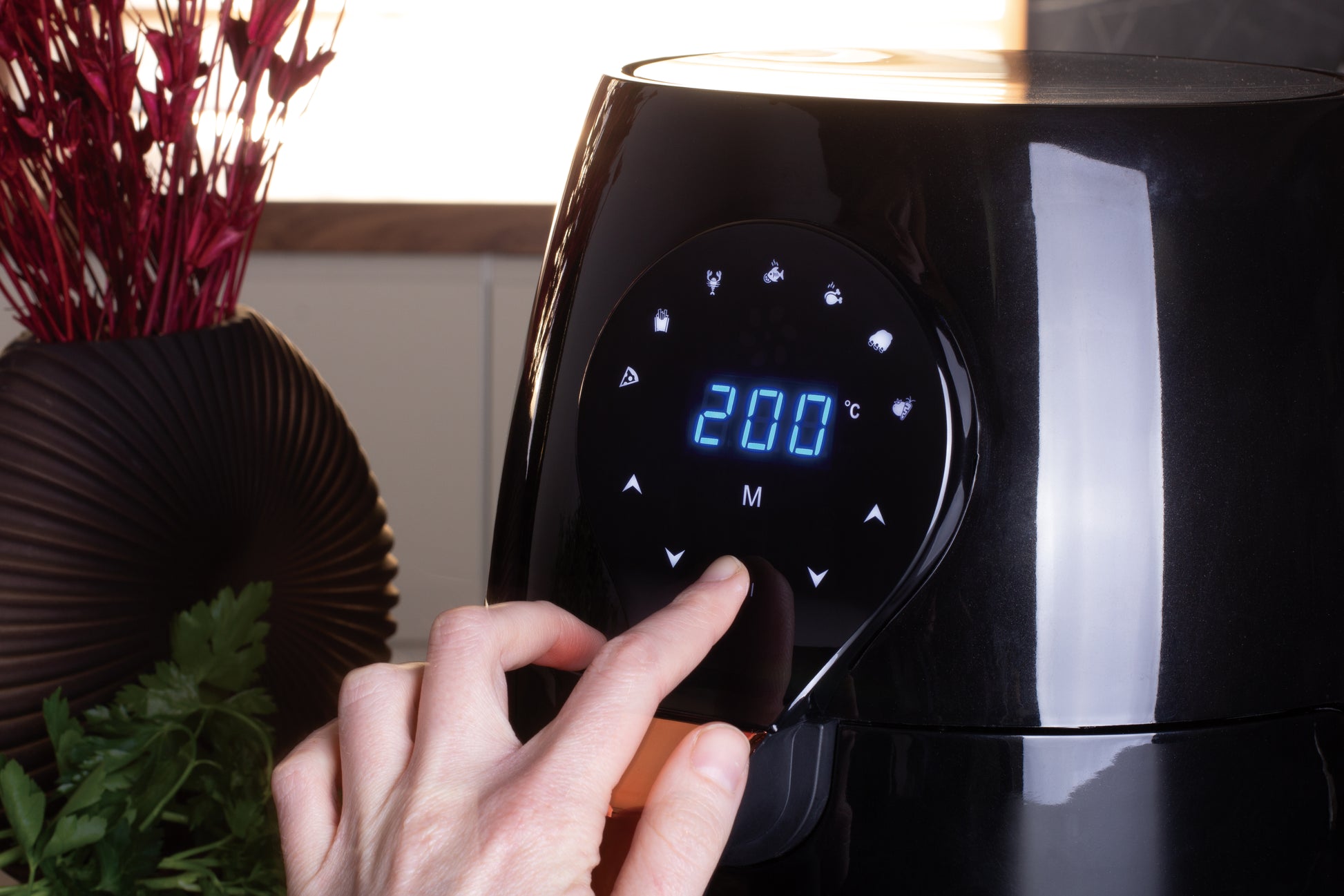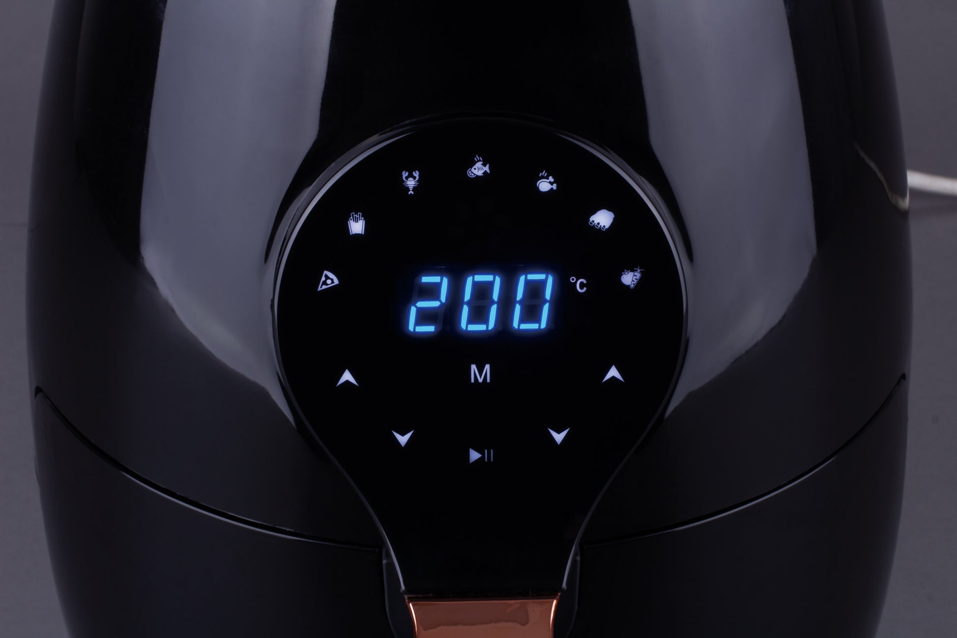 Airfryeren har elegant digitalt LED display med touchsensor og antiskli knotter på undersiden.