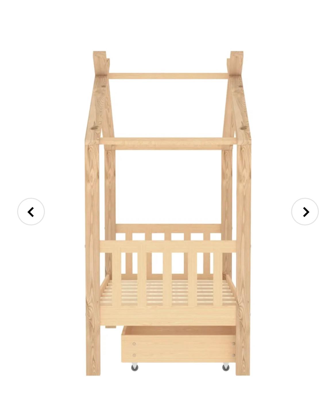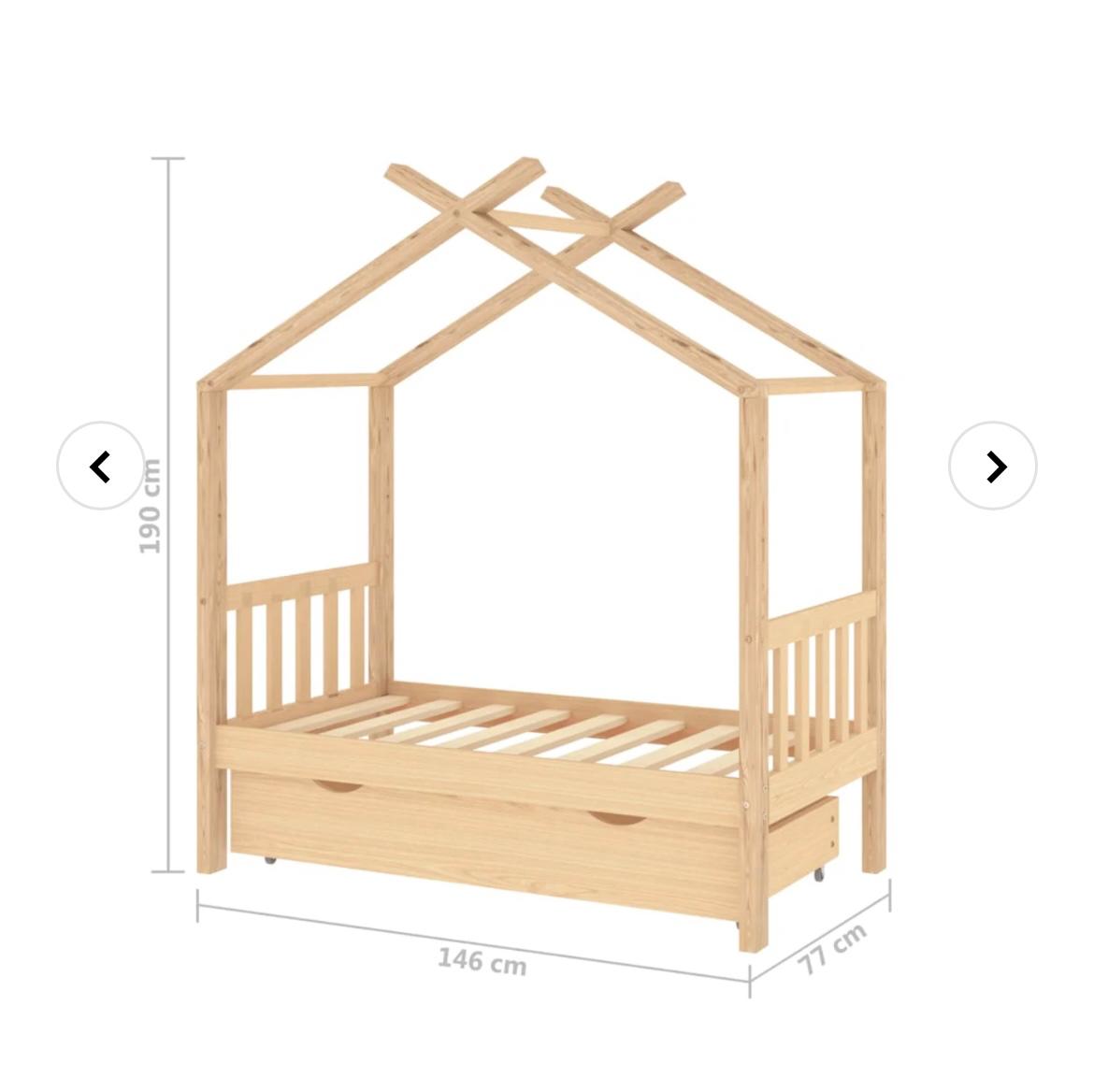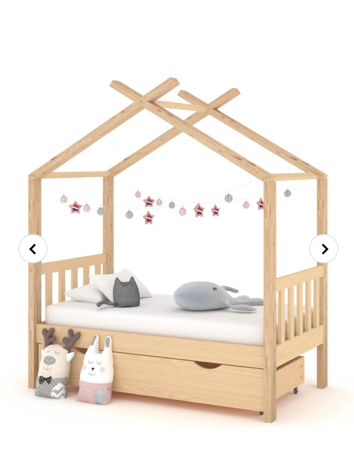 Sengen er smart designet med en ramme formet som et trehus der du kan henge gardiner for å gi barnet mer privatliv. Den kan også brukes som en lesekrok eller et lekehus. Denne sengerammen er laget i heltre furu, og er ekstremt robust og holdbar. De sterke lamellene gir den nødvendige støtten og er svært komfortable. Den medfølgende sengeskuffen med 2 håndtak gir god lagringsplass for oppbevaring av brettede klær, leker osv., slik at rommet blir rent og ryddig. De lettglidende hjulene kan fungere på både teppegulv og tregulv. Denne sengerammen er egnet for en madrass på 70 x 140 cm.