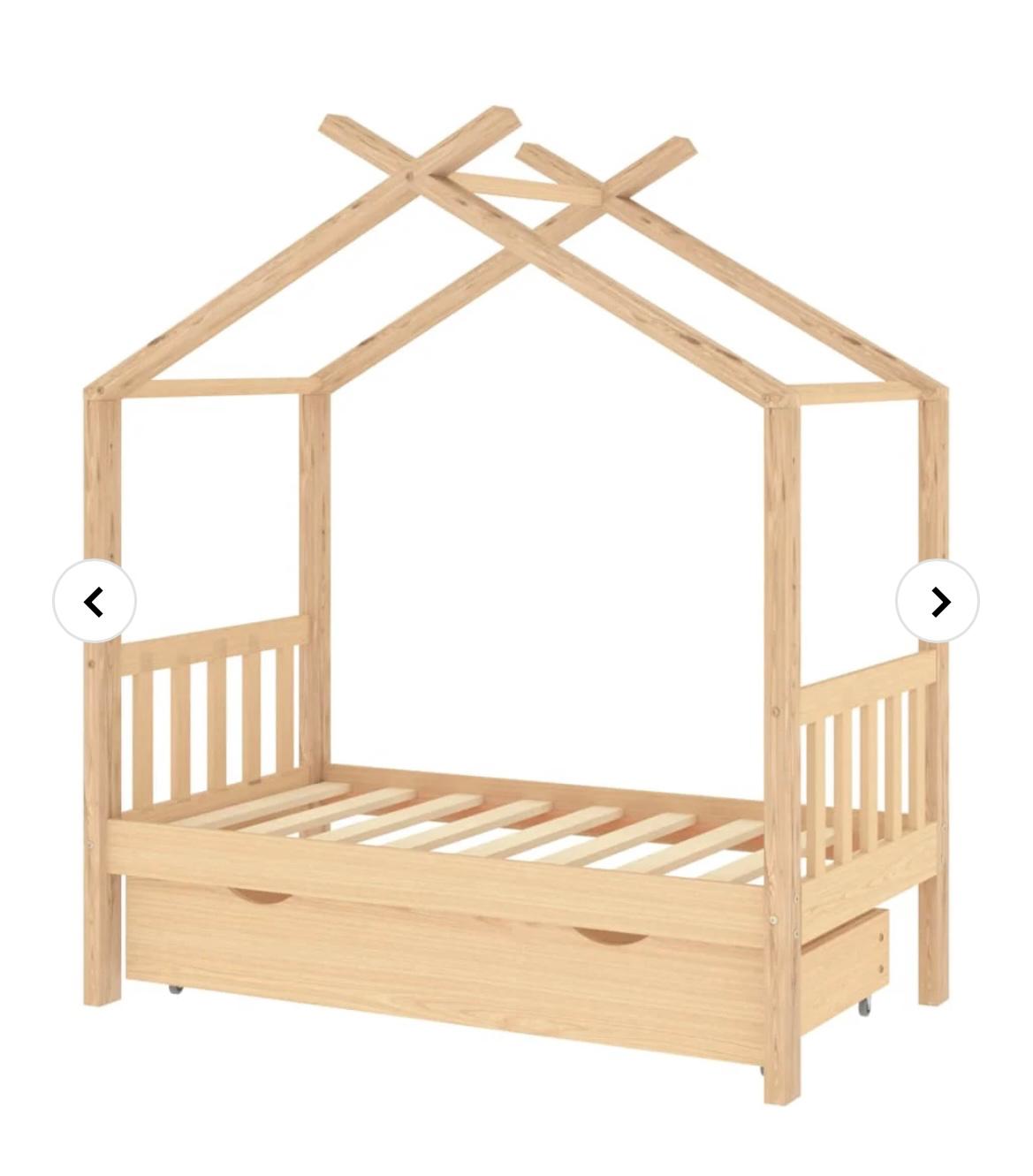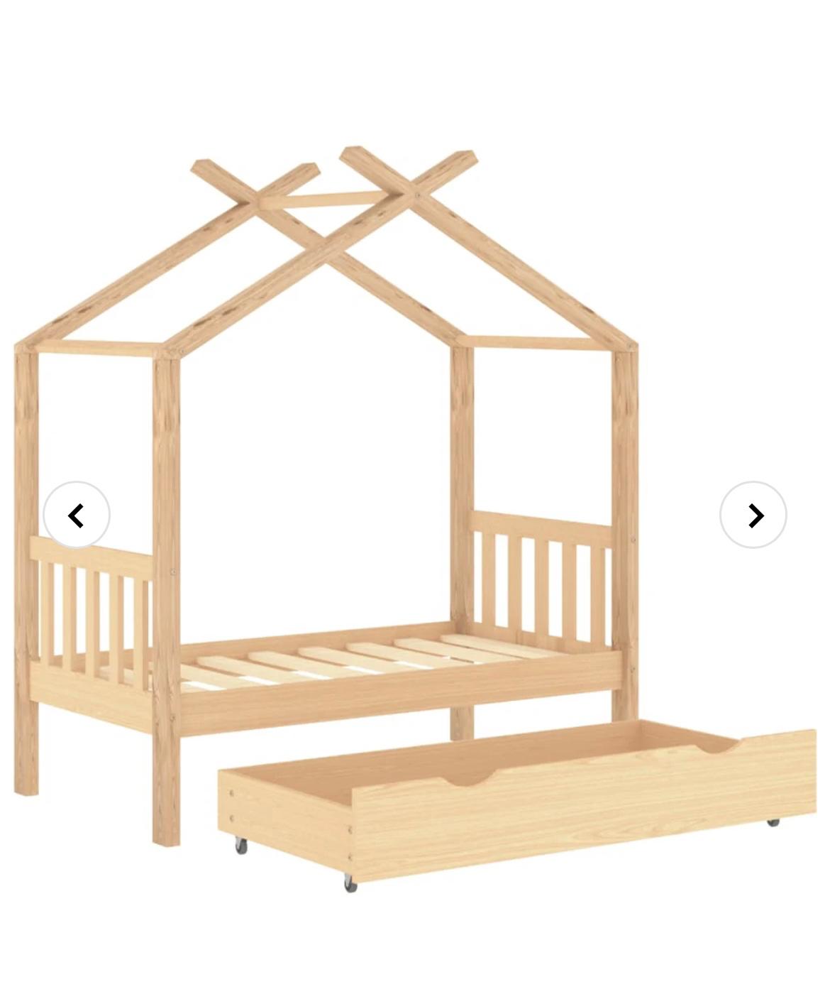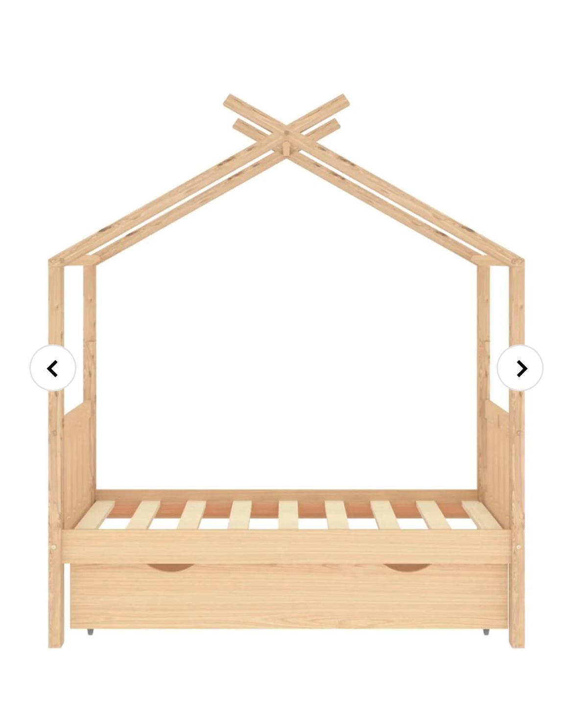Sengen er smart designet med en ramme formet som et trehus der du kan henge gardiner for å gi barnet mer privatliv. Den kan også brukes som en lesekrok eller et lekehus. Denne sengerammen er laget i heltre furu, og er ekstremt robust og holdbar. De sterke lamellene gir den nødvendige støtten og er svært komfortable. Den medfølgende sengeskuffen med 2 håndtak gir god lagringsplass for oppbevaring av brettede klær, leker osv., slik at rommet blir rent og ryddig. De lettglidende hjulene kan fungere på både teppegulv og tregulv. Denne sengerammen er egnet for en madrass på 70 x 140 cm.