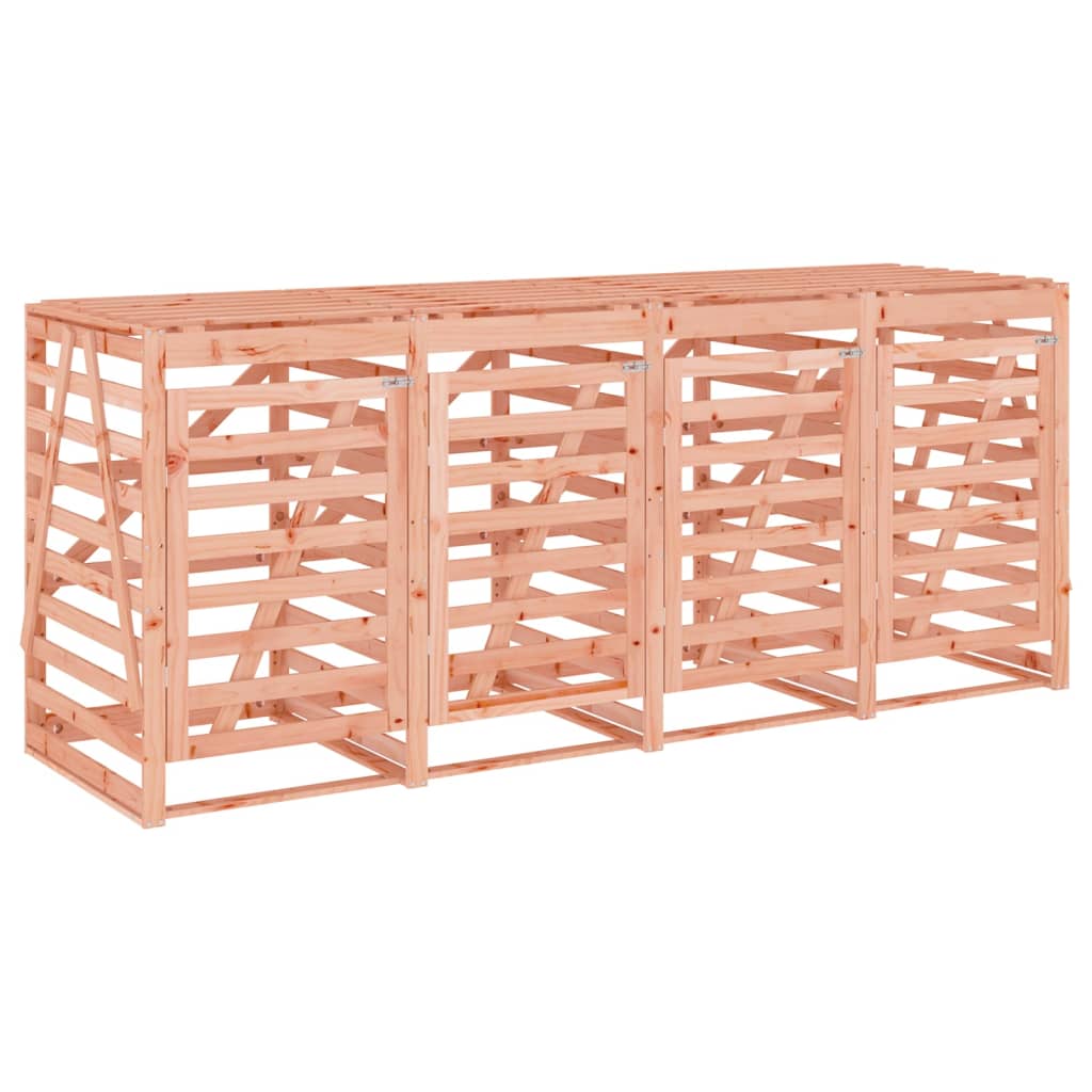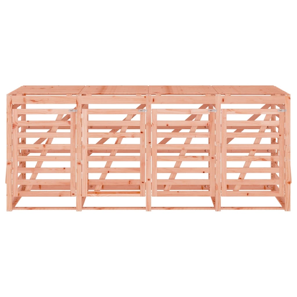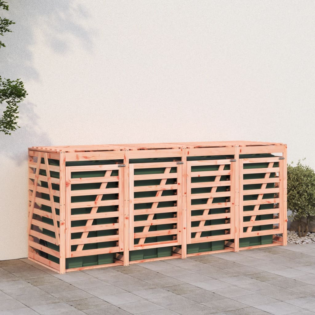 - Heltre douglasgran: Søppeldunkskuret er laget av heltre douglastre for stabilitet og holdbarhet. Heltre douglastre er et svært slitesterkt tre som er perfekt for utendørs bruk. Douglastre er også sterkt og trenger mindre vedlikehold selv under dårlig været.