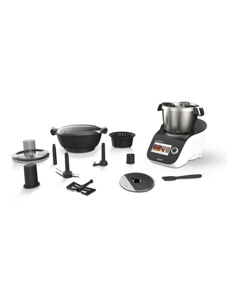 Denne foodprosessoren med berøringsskjerm kommer med diverse tilbehør som hakkeblad, 3 dampkurver i forskjellige størrelser, matskyver, lokk for matforedling, vendbart skiveblad, røremaskin, vispfeste, blenderlokk og en bolle i rustfritt stål. Derfor kan du bruke roboten med alle dens funksjoner uten å måtte kjøpe separat tilbehør.