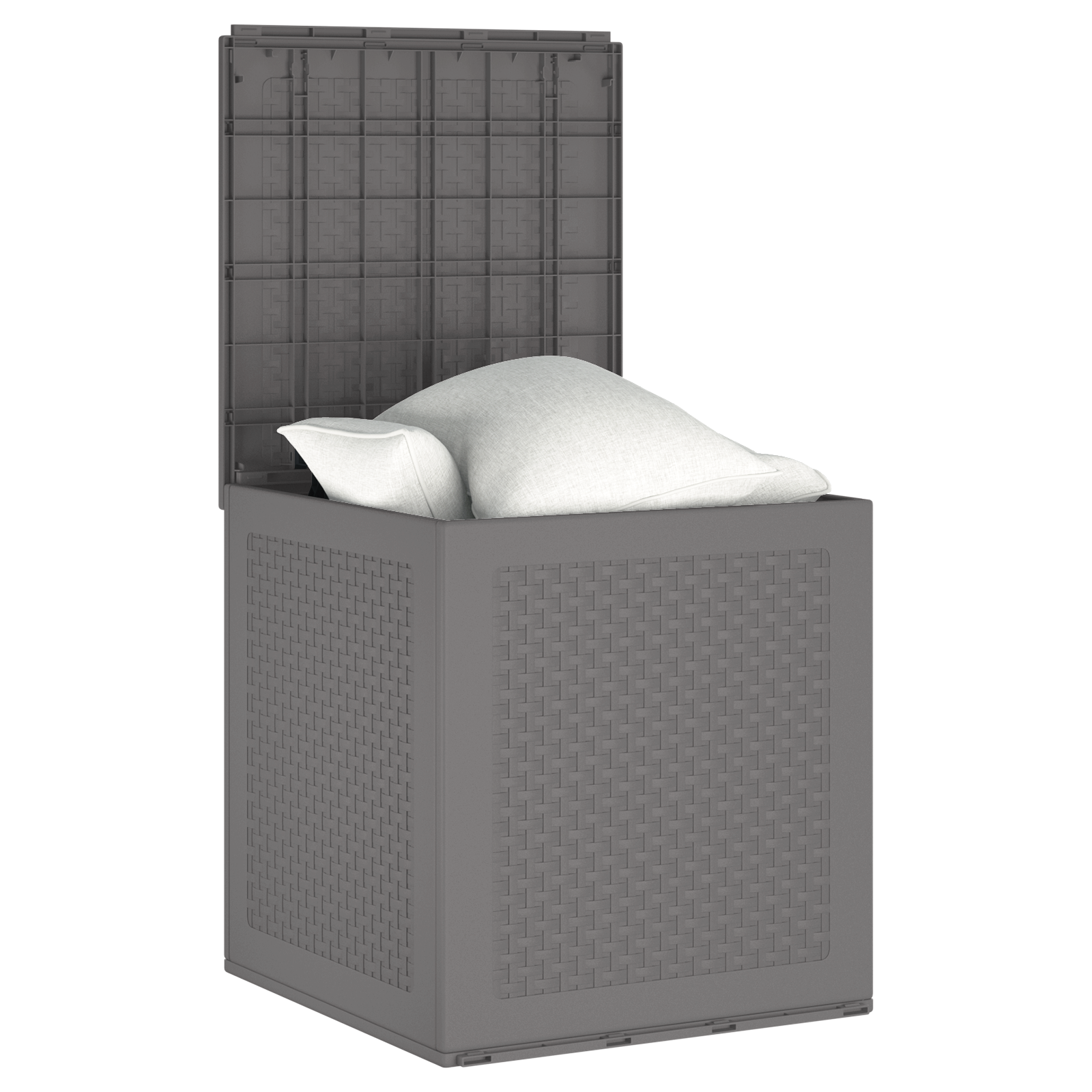 Denne mellomstore utendørs oppbevaringskisten er superpraktisk for uteområder. Den lyse grå fargen og det kubiske designet gjør den stilig og moderne, perfekt for å holde det du trenger lett tilgjengelig samtidig som det ser ryddig ut.