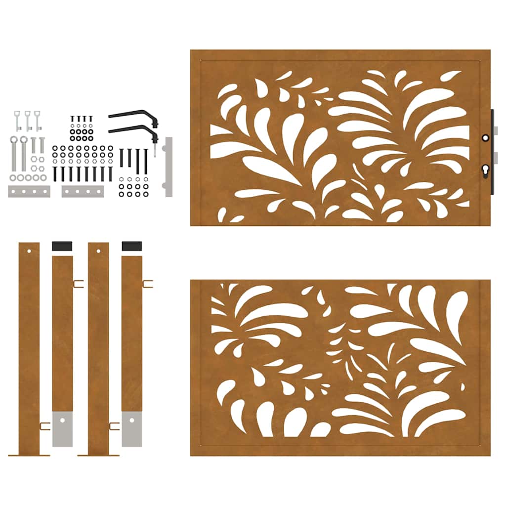 - Kraftig konstruksjon: Denne gjerdeporten er laget av forvitringsstål. Forvitringsstål er anti-korrosjon i sin natur. Den utvikler et rustent beskyttende lag mot korrosjon når det først utsettes for atmosfæriske forhold. Dermed trenger du ikke å male den. Dette kan hjelpe deg med å spare på vedlikeholds- og reparasjonskostnader. Den karakteristiske brunfargen på forvitringsstålet vil garantert være et blikkfang. Endelig er forvitringsstål eksepsjonelt holdbart og vil tåle tidens tann.