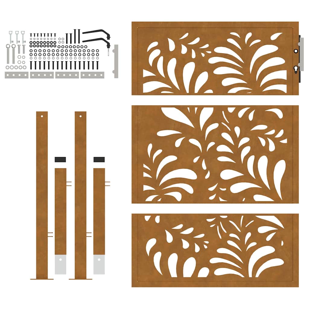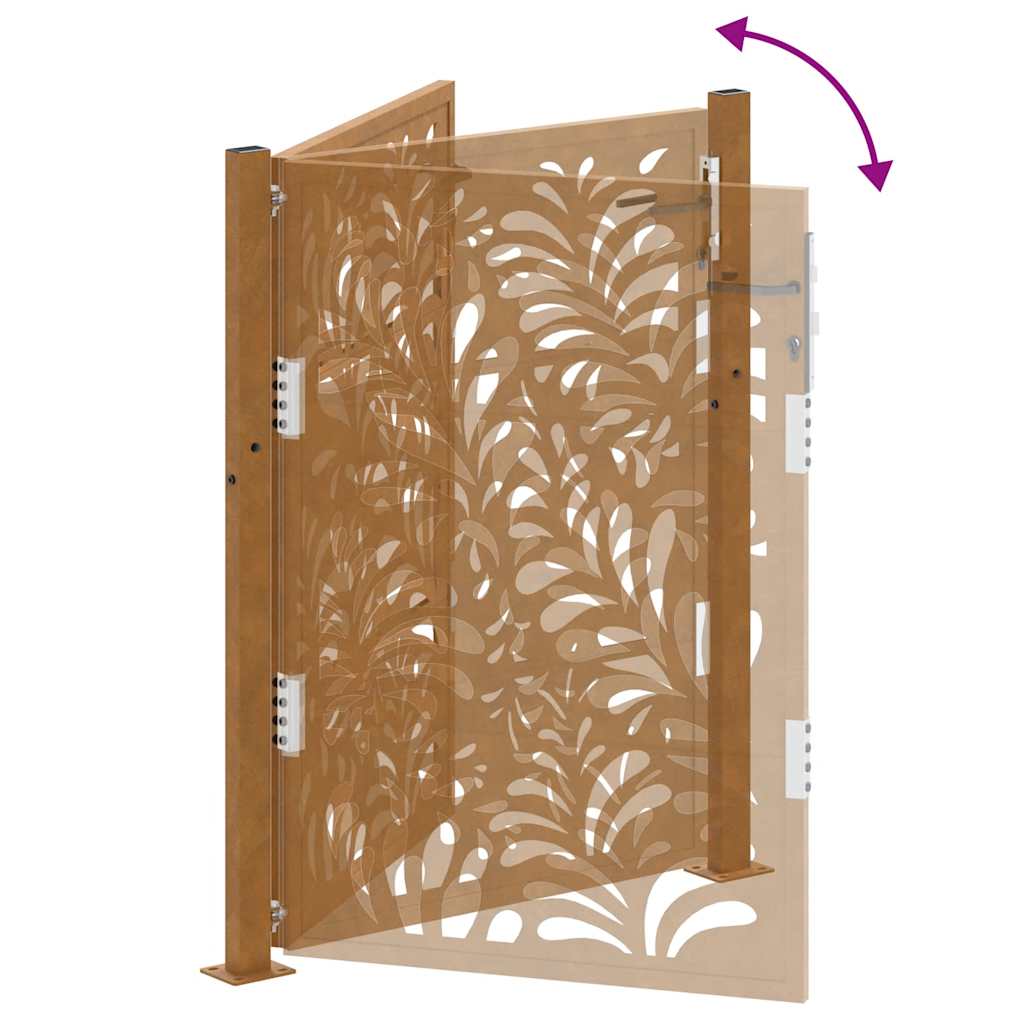 - Kraftig konstruksjon: Denne gjerdeporten er laget av forvitringsstål. Forvitringsstål er anti-korrosjon i sin natur. Den utvikler et rustent beskyttende lag mot korrosjon når det først utsettes for atmosfæriske forhold. Dermed trenger du ikke å male den. Dette kan hjelpe deg med å spare på vedlikeholds- og reparasjonskostnader. Den karakteristiske brunfargen på forvitringsstålet vil garantert være et blikkfang. Endelig er forvitringsstål eksepsjonelt holdbart og vil tåle tidens tann.