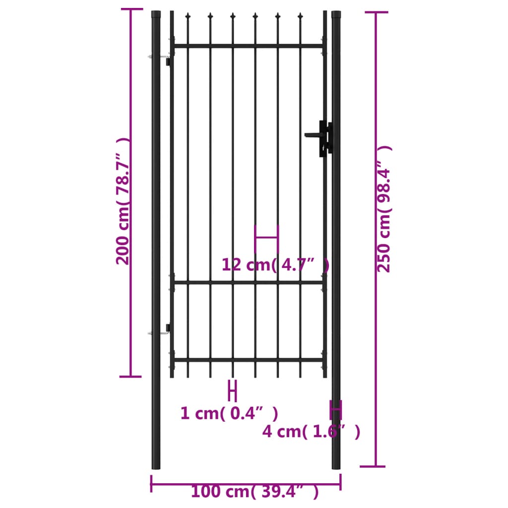 Med loddrette stenger med spisser på toppen og en sterk, horisontal støttebjelke som forsterkning, vil hageporten vår gi en høy grad av privatliv og sikkerhet, og samtidig danne en fantastisk inngangsport til eiendommen din. Porten er produsert i kraftig stål og er pulverlakkert for å beskytte den mot rust og korrosjon.