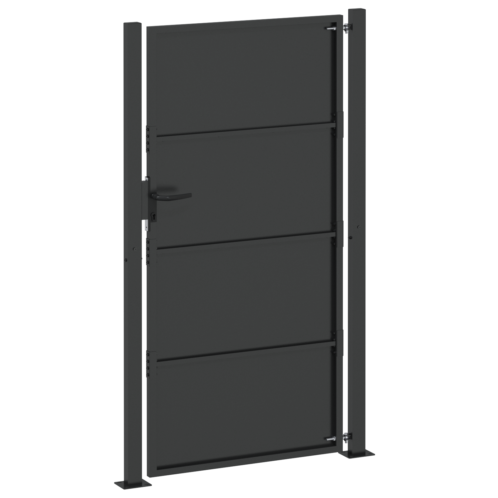 Denne hageporten er en stilig og praktisk måte å sikre uteområdet ditt på. Den er perfekt for hager og terrasser, og det moderne utseendet passer inn alle slags landskap, samtidig som den holder uønskede besøkende unna. Med sin glatte overflate og elegante linjer gir den et classy preg uten å overvelde utseendet ditt. Laget for utendørs bruk, passer denne porten rett inn og kombinerer skjønnhet med sikkerhet for en flott inngang.