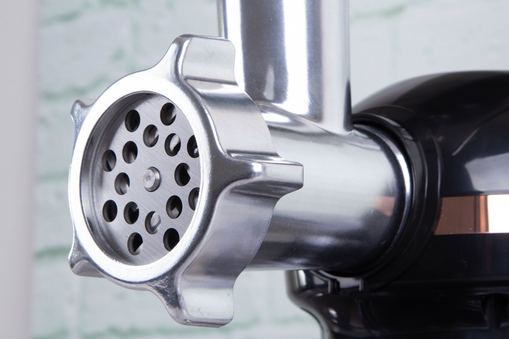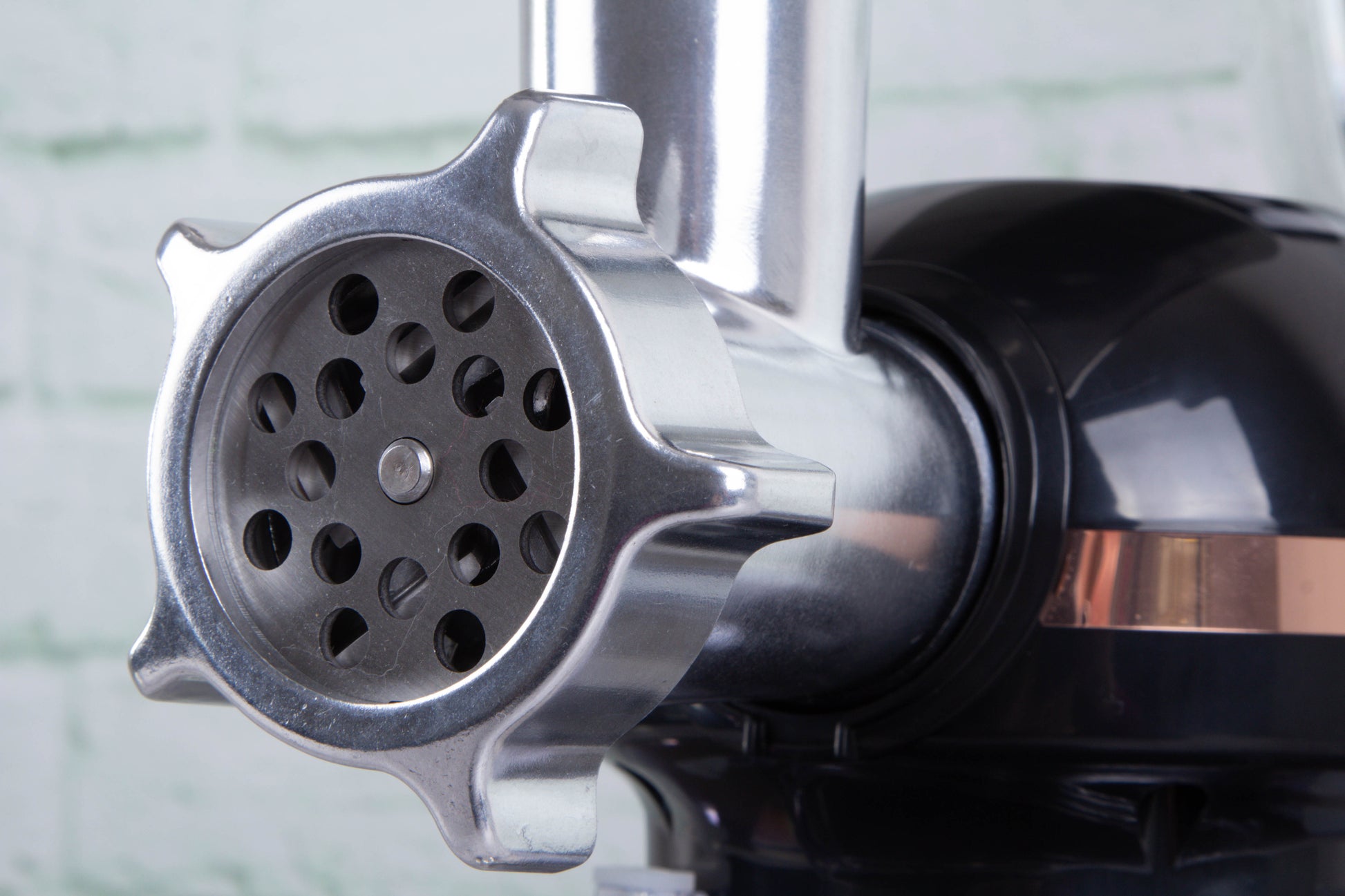 Kjøttkvern med matebrett og flere forskjellige hullskiver